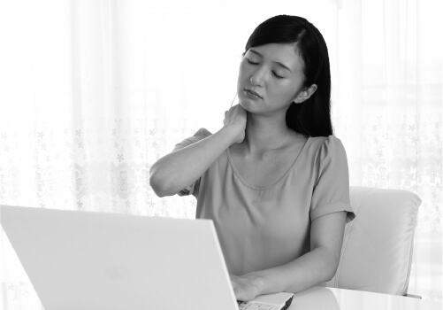 カラダにゆがみがある状態で、長時間のデスクワークなど頭を前に突き出すような姿勢を続けると、本来分散されるべき重さが肩周辺の筋肉に集中する「間違った動き」を日常的に行っていることになります。これが筋肉の緊張を引き起こし、血流を悪化させる原因となるのです。
